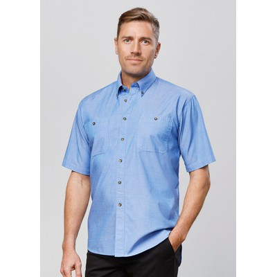Features: Button down collar with tortoise shell buttons. 2 Chest pockets with 1 pen pocket, twin stitched. Traditional fit with centre back box pleat. Available in Chambray Blue with Tortoise shell buttons.