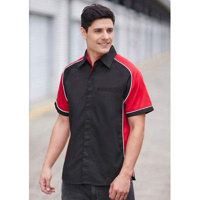 Fabric: 65% Polyester, 35% Cotton Twill. Features: Contrast panels with piping detail and side splits. Concealed placket and jet pocket.