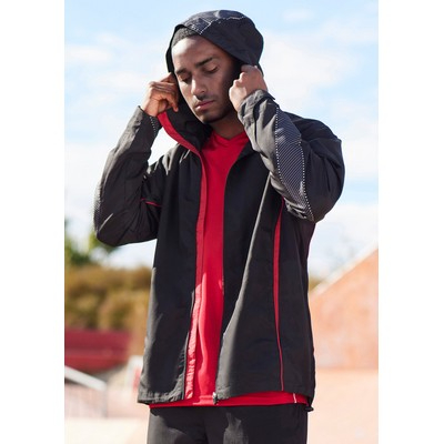 Features: Grid mesh underarm panels for breathability. Stow-away hood with print feature. Unique sleeve print feature with adjustable cuff fasteners. 2 Side zippered pockets. Contrast panels, piping and inside placket.