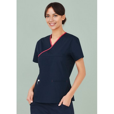 Features: Stylish crossover feature with contrast trim. 2 Front welt pockets with contrast stitching detail. Side splits.